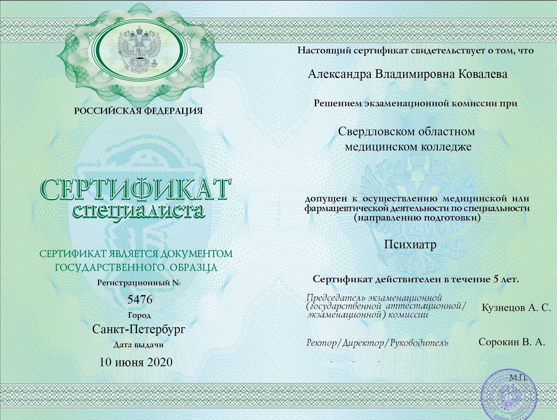 • 1995-1997 г. Специализация - клиническая ординатура на кафедре «Нервных болезней и Нейрохирургии» РостГму, сертификат специалиста по специальности – «Неврология» (с 1997г.)